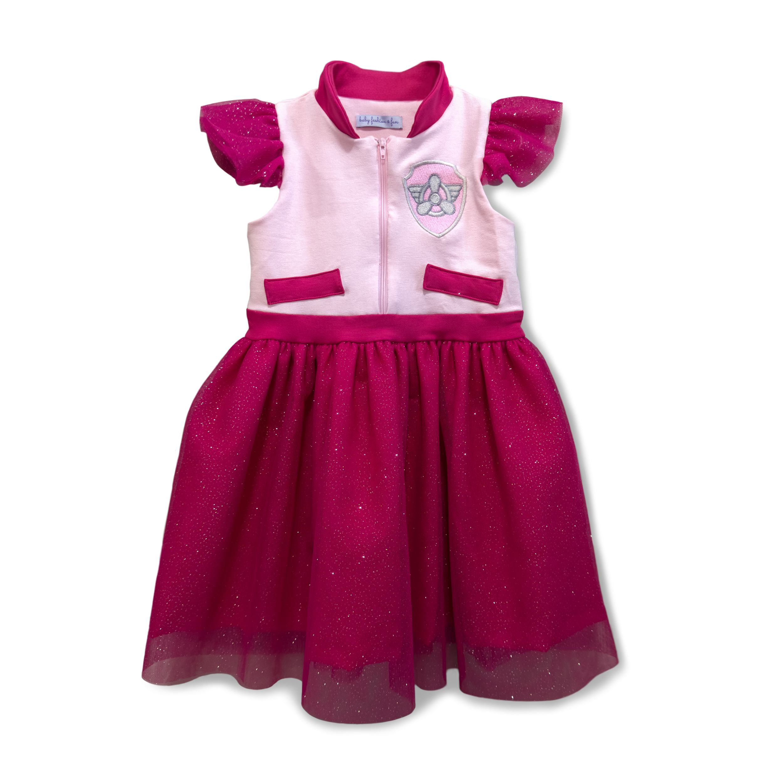 Vestido fantasia Skye - Patrulha Canina (Glitter) - Corpinho em moletinho de algodão, bordado do brasão, saia externa em tule glitter e fecho na frente de ziper.